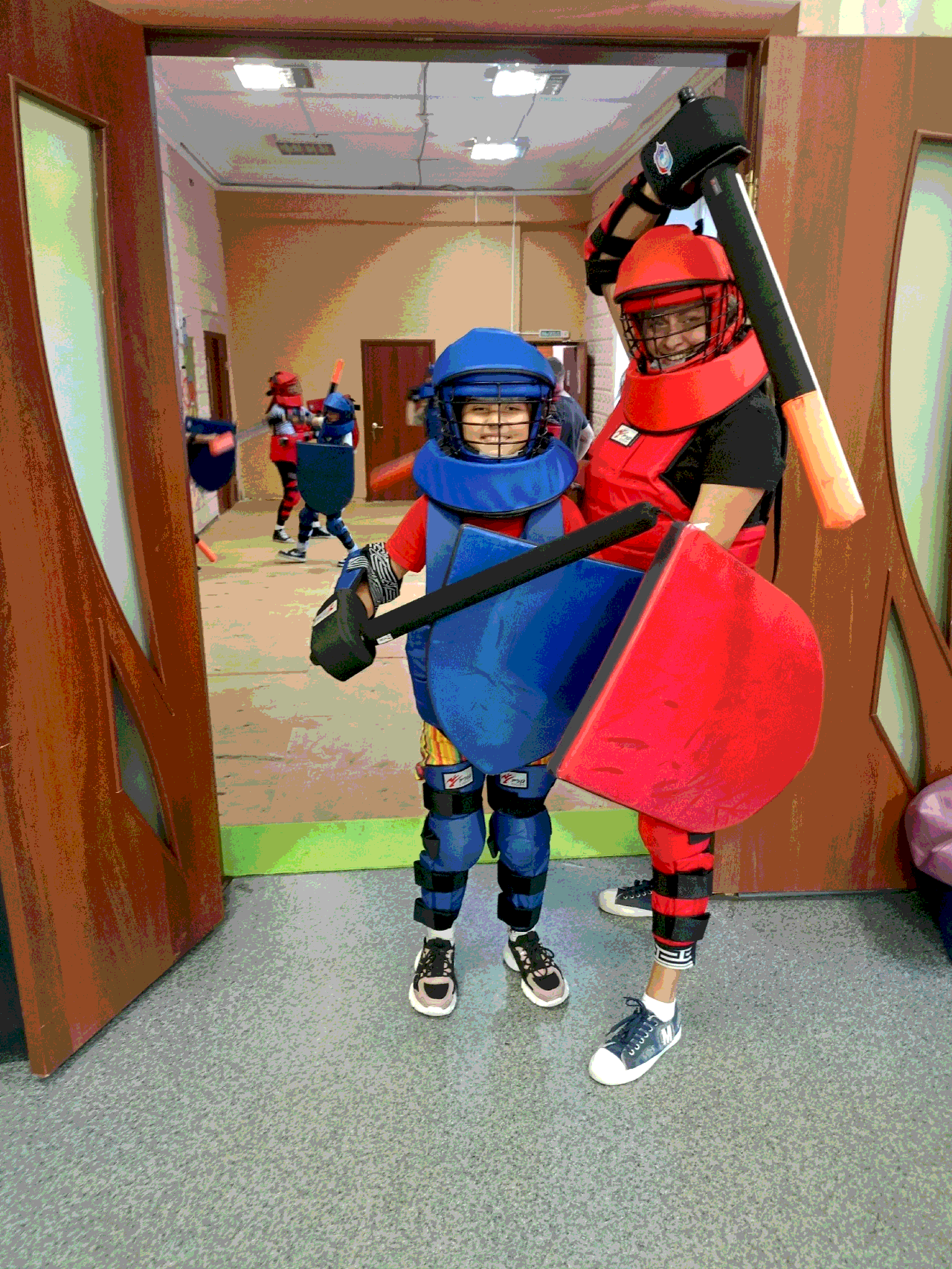 ✅щит и меч сделаны из мягких полимерных материалов, а на бойцах специальная защитная экипировка, включающая шлем, защиту корпуса, ног, локтя и кисти;