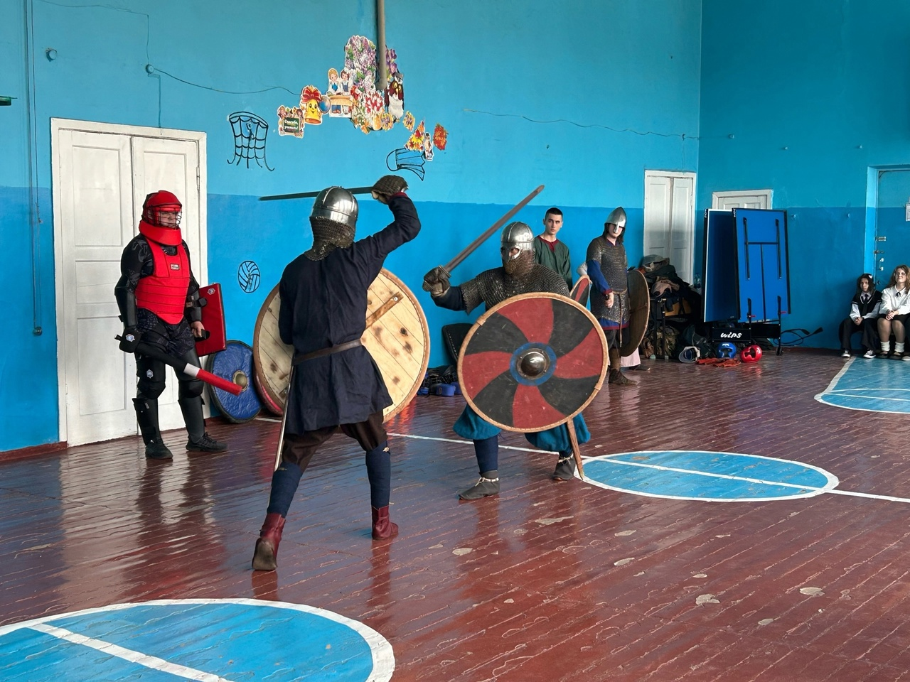 Рассказали ученикам о воинах времен становления Руси, продемонстрировали поединок и строевую работу ранесредневековых бойцов.