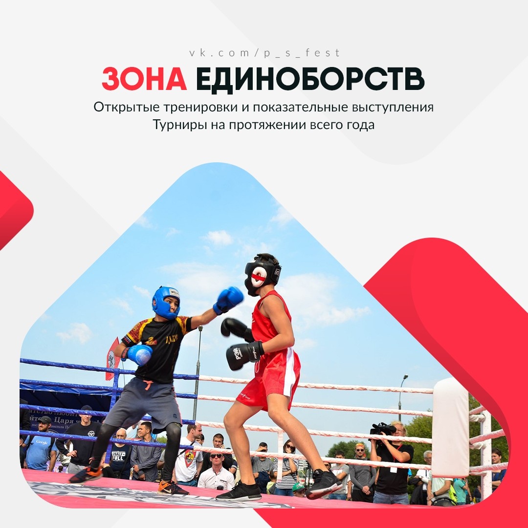 На площадке Единоборств будут организованы турниры по боксу и панкратиону при поддержке клубов: Агиос , школа бокса - Торпедо и Клуб бокса -Угреша, а также показательные выступления и открытые тренировки от известных спортсменов и тренеров.