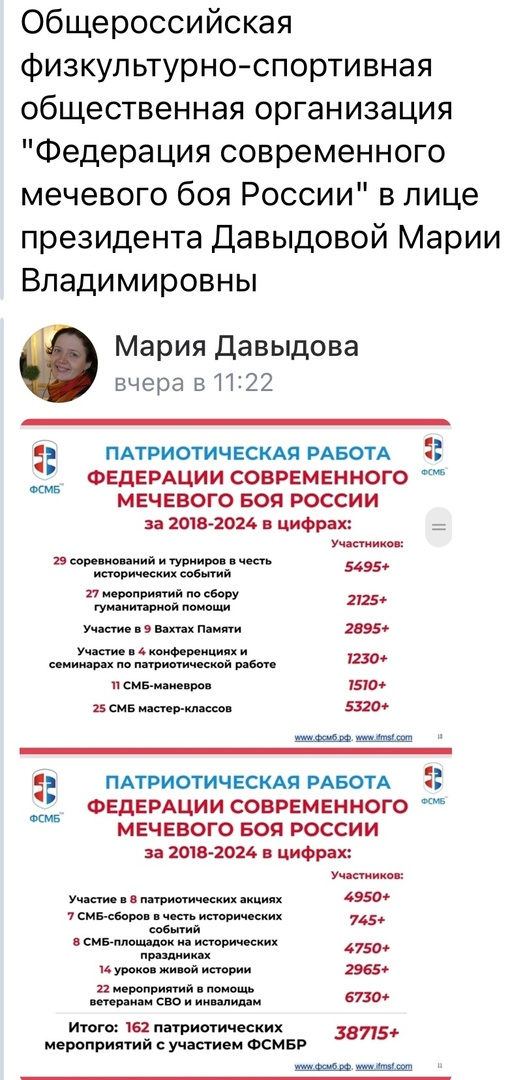 С Мария Давыдова обсудили ранее прошедшее (23 ноября) мероприятие с детьми в рамках проекта «Дети наших Героев» и пришли к решению продолжить работу с детьми по спортнаправлению «Современный мечевой бой».