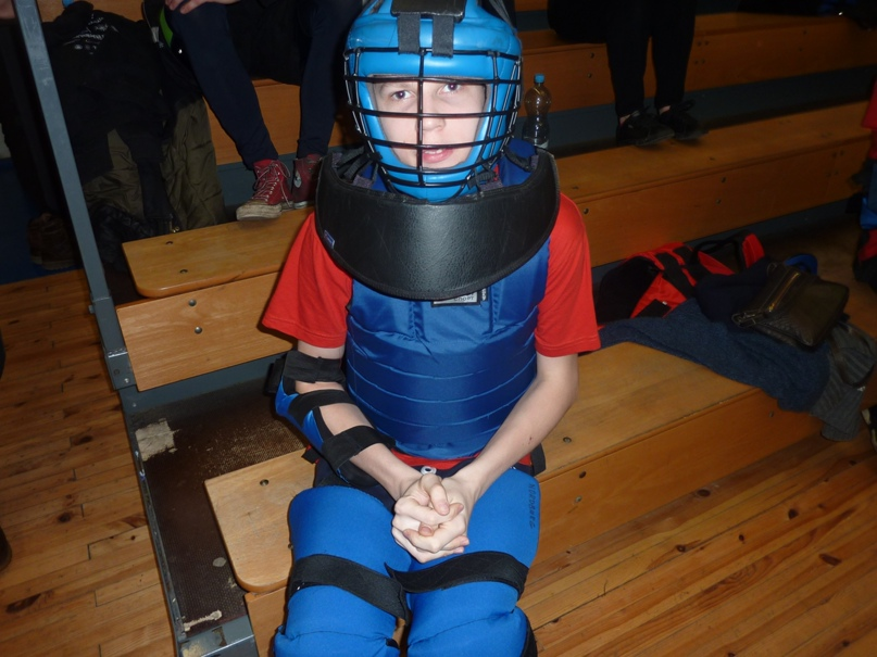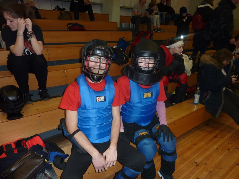 Встретившись с Аленой Полуротовой и Каспаром на ЖД-вокзале в Риге, мы поехали в спортивную школу, где проходил турнир. В просторном, светлом, но прохладном (зато в снаряжении было не жарко) зале было два ристалища: на одном проходили бои триатлона и щит-меч (у Лиги B), а на другом - шашка-баклер. У нас также был триатлон; инструктором выступила неутомимая Алена, которая нашла такую возможность среди своих организаторских дел. В этот раз у нас не только номинации по очереди сменяли друг друга, но и инструктор менял руки: так сложилось, что на щит-мече Алена (которая, вообще-то, левша;)) вышла с нами правшой, а на баклере и полуторном мече — левшой. Так что мы получили интересный опыт — пришлось быстро адаптироваться к происходящему.