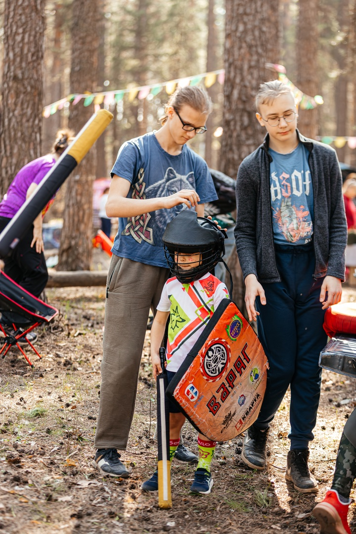 На стартовой поляне тем временем Виктор Пашенцев и Станислав Головин развлекали юных лесобежцев боями и учили правилам достойного мечевого поединка.