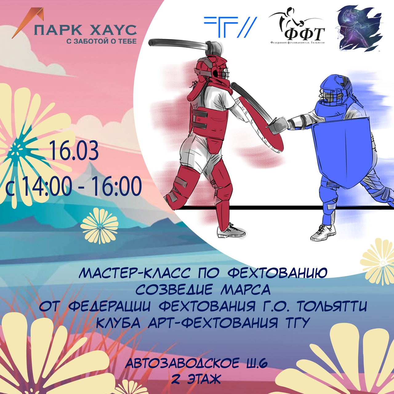 16 марта с 14:00 до 16:00 Состоится Мастер-класс по фехтованию "Созвездие Марса" от Федерации фехтования г.о. Тольяттии совместно с клубом Арт-фехтования ТГУ 🔥