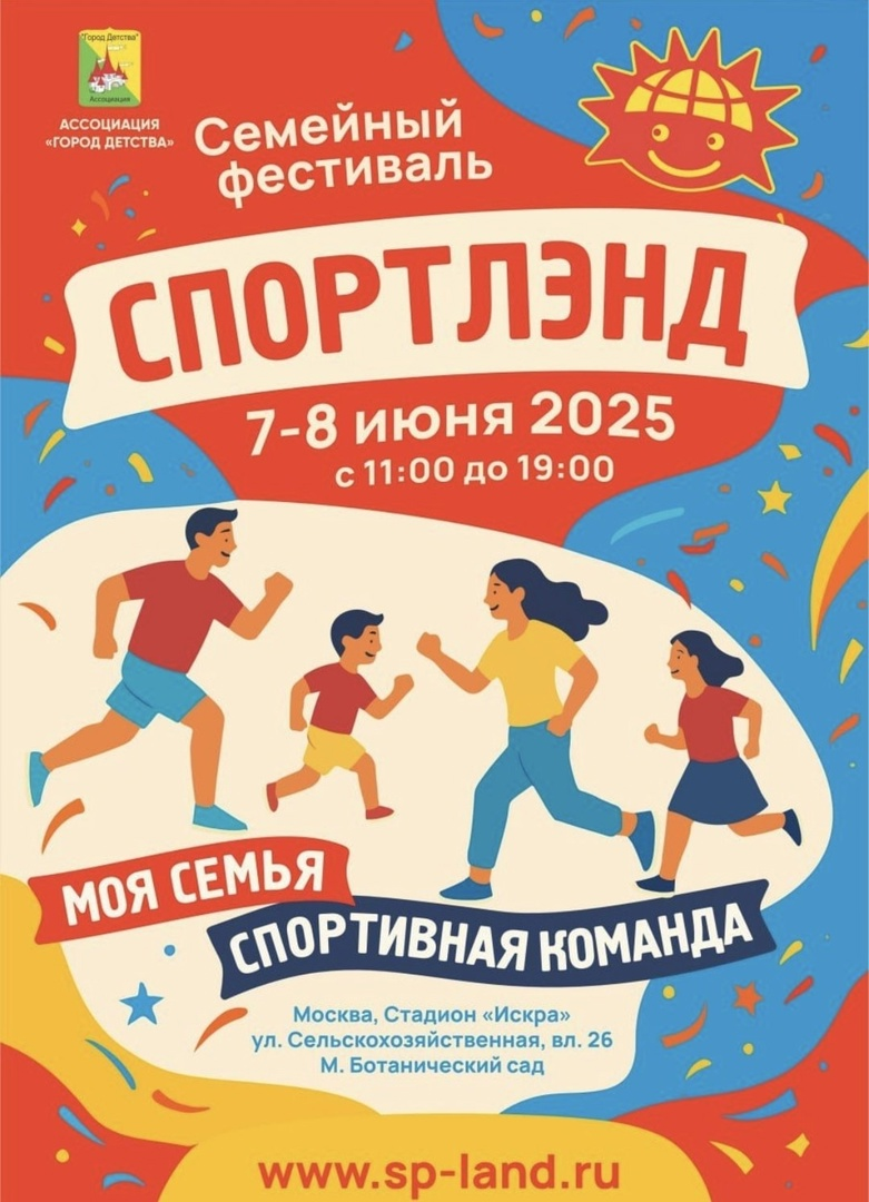 Дорогие семьи нашей необъятной страны! Уже 7 и 8 ИЮНЯ 2025 года в рамках празднования двух важнейших событий — Дня защиты детей и Дня России, состоится масштабное спортивное и культурное событие в жизни столицы — Семейный фестиваль «СПОРТЛЭНД», который направлен на формирование здорового образа жизни и совместного семейного досуга.