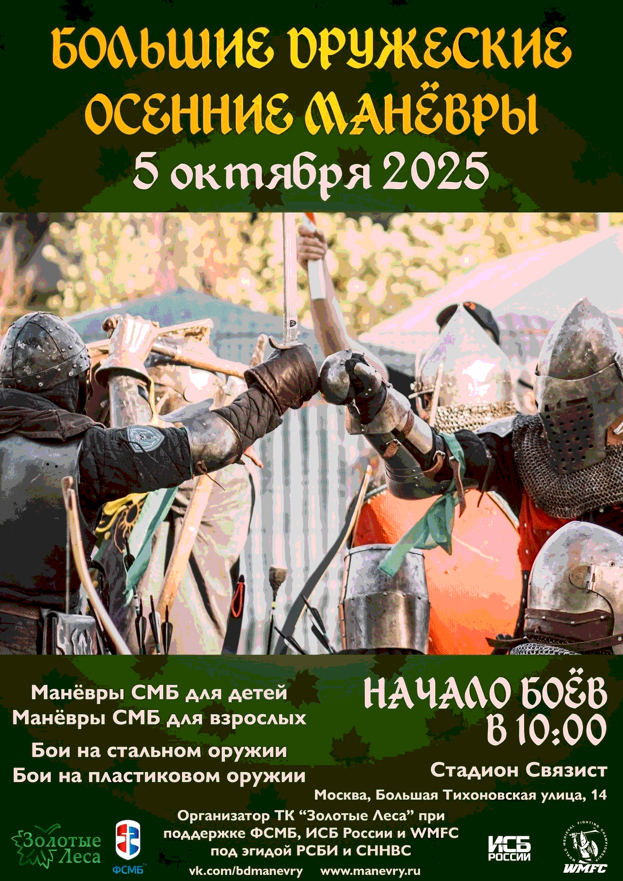 Большие Дружеские Осенние Маневры по Современному Мечевому Бою 2025 пройдут 5 ОКТЯБРЯ (воскресенье) на стадионе "Связист" по адресу: г. Москва, ул. Большая Тихоновская, д. 14 ( yandex.ru/maps/-/CLU... )